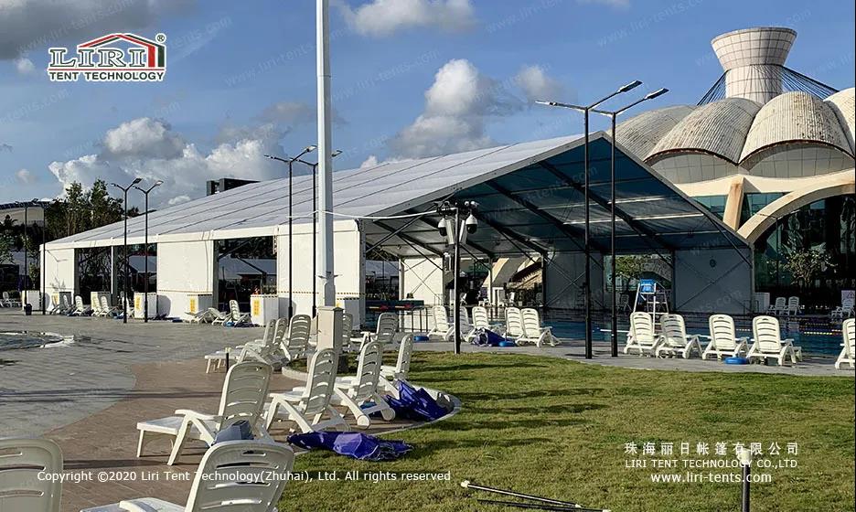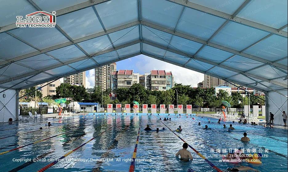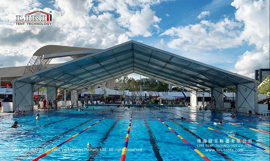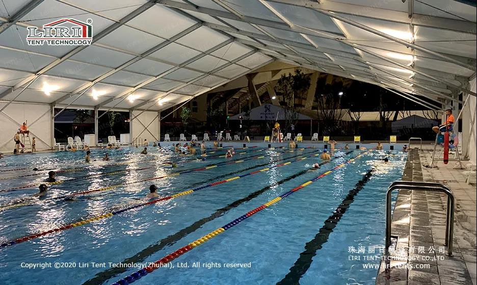 Recently, Liri Tent provided a canopy tent to cover the outdoor swimming pool of a sports center. It is a prefabricated tent structure with a size of 30x30m. It only occupies half the size of the swimming pool, and let the other half remain open-air so that there will be more options. The half-open half-closed sides give better ventilation and a wilder view.