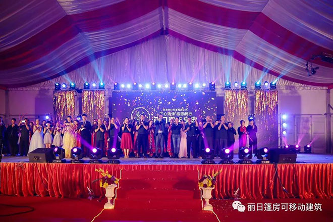 The speech of Chairman Chen Li was the most touching part in this grand celebration. For many years, Liri insists on being a private enterprise with social responsibility and insisted on participating in various public welfare activities as far, such as the Wenchuan, the Yushu and the Ya’an earthquake, Doumen Overseas Chinese Medicine Hospital, Zhuhai’s typhoon relief, but also actively involved in sports, many times for large-scale events to provide tents building structures. Ms. Chen Li, believes that public welfare is a way to spread positive energy to the society during the day and is a concrete action to return to the society in the day. It is also part of the corporate culture in the company. She also mentioned, in particular, the old staff who have been working for Liri more than 10 years. She believes that employees are the company’s most valuable asset in the past 20 years. Thanksgiving all workers devoted her best life to Liri, From a small workshop of less than 500 square meters, it has grown up to be a large-scale tent manufacturer and an industry leader, and now covers an area of more than 120,000 square meters. The future will also continue to invest, increase the company’s benefits to all the workers, let everyone share the fruits and glory with Liri.