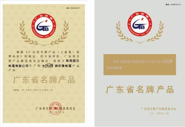 Recently, the list of 2016 “brand-name products in Guangdong Province” was made public. With excellent product technology, powerful manufacturing ability, and superior product quality, Liri Tent’s “folding tent” was entitled as “brand-name products in Guangdong Province”.
